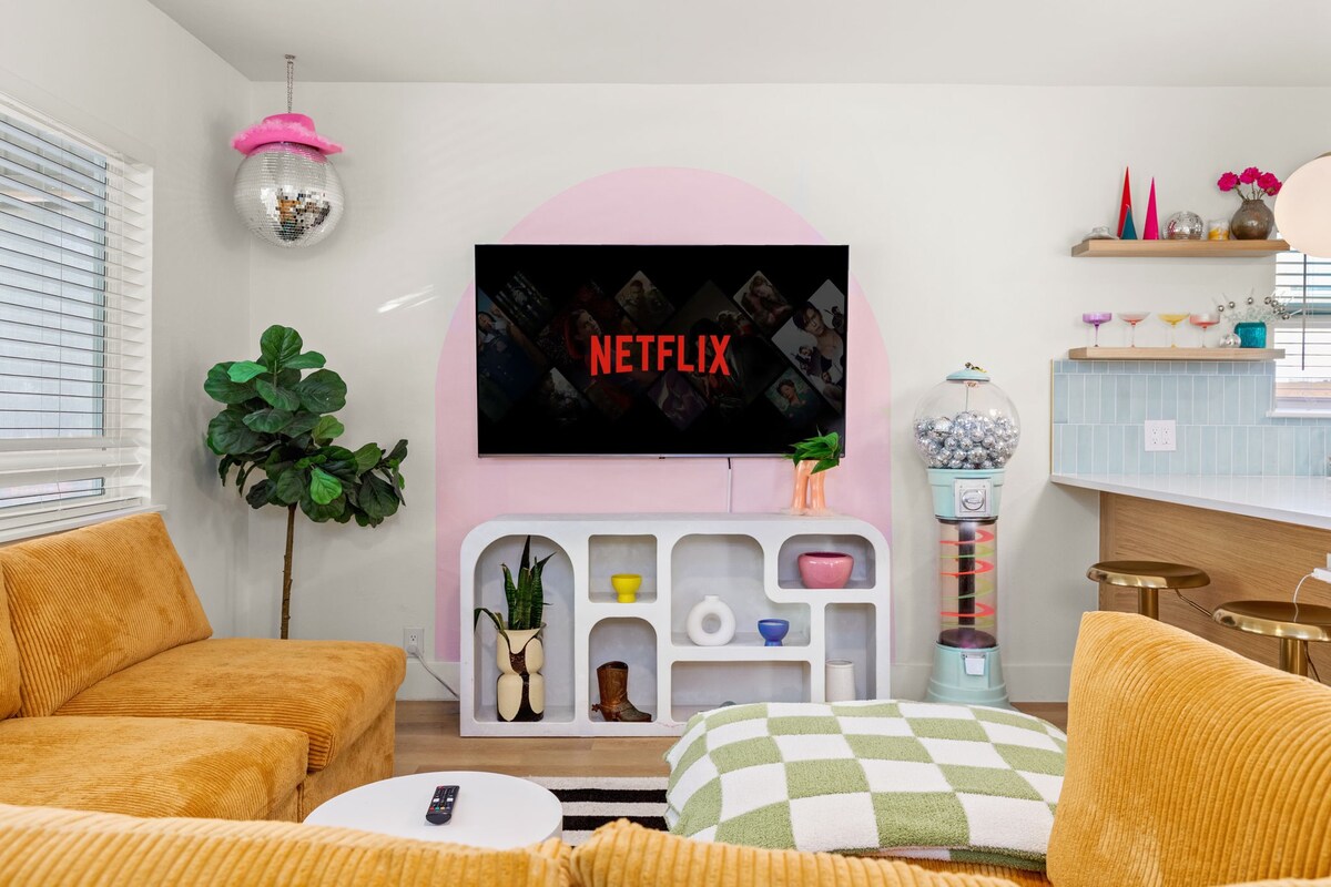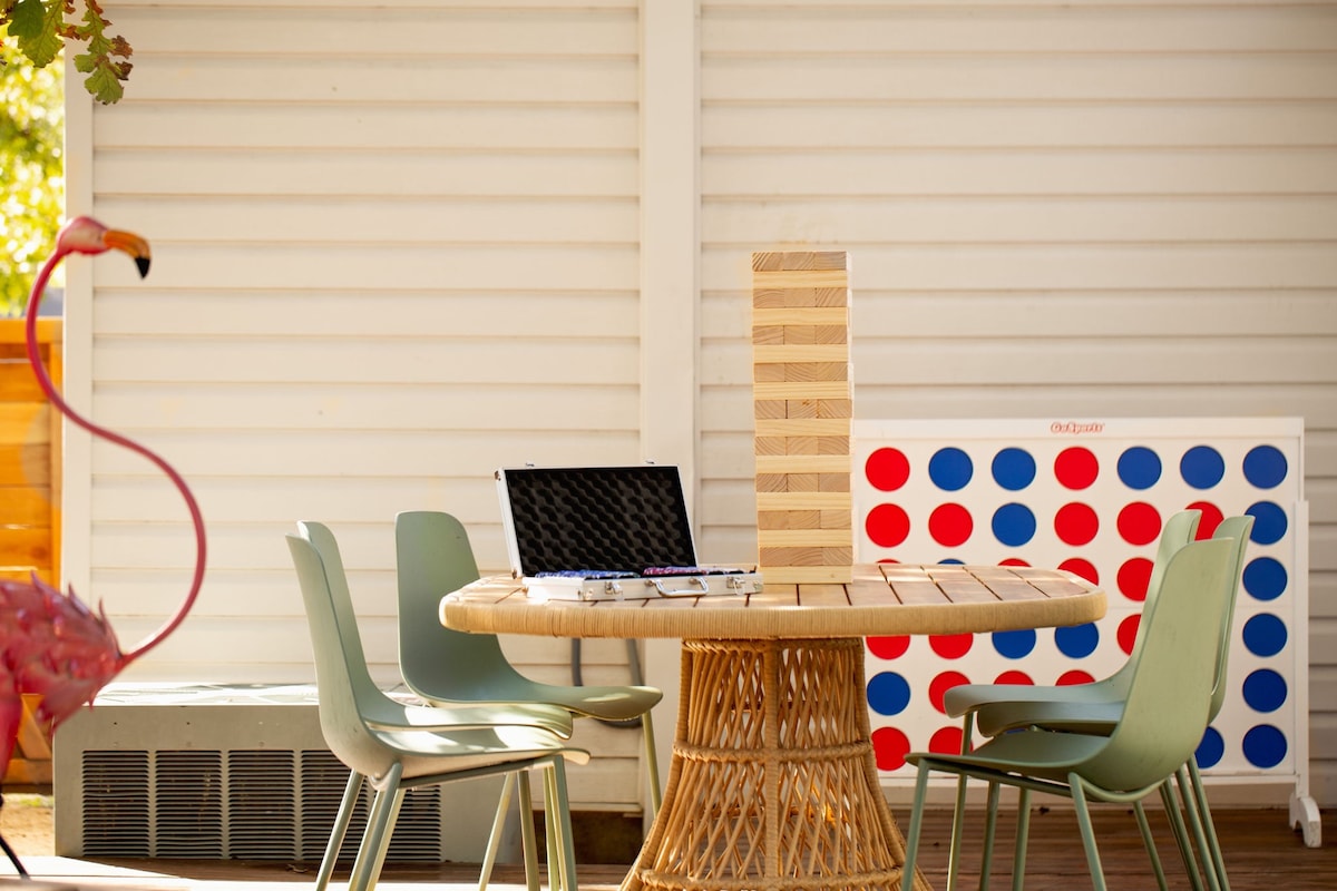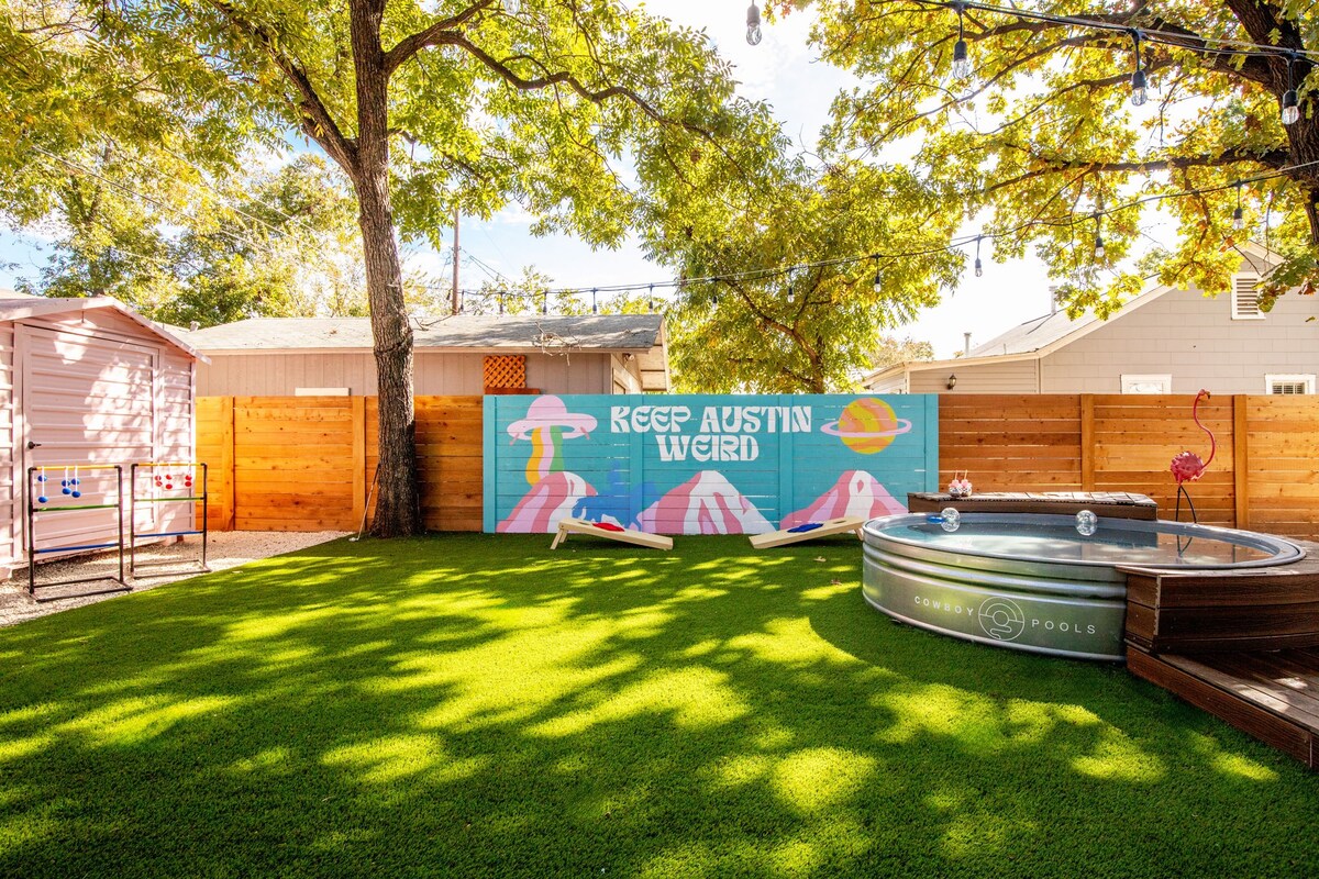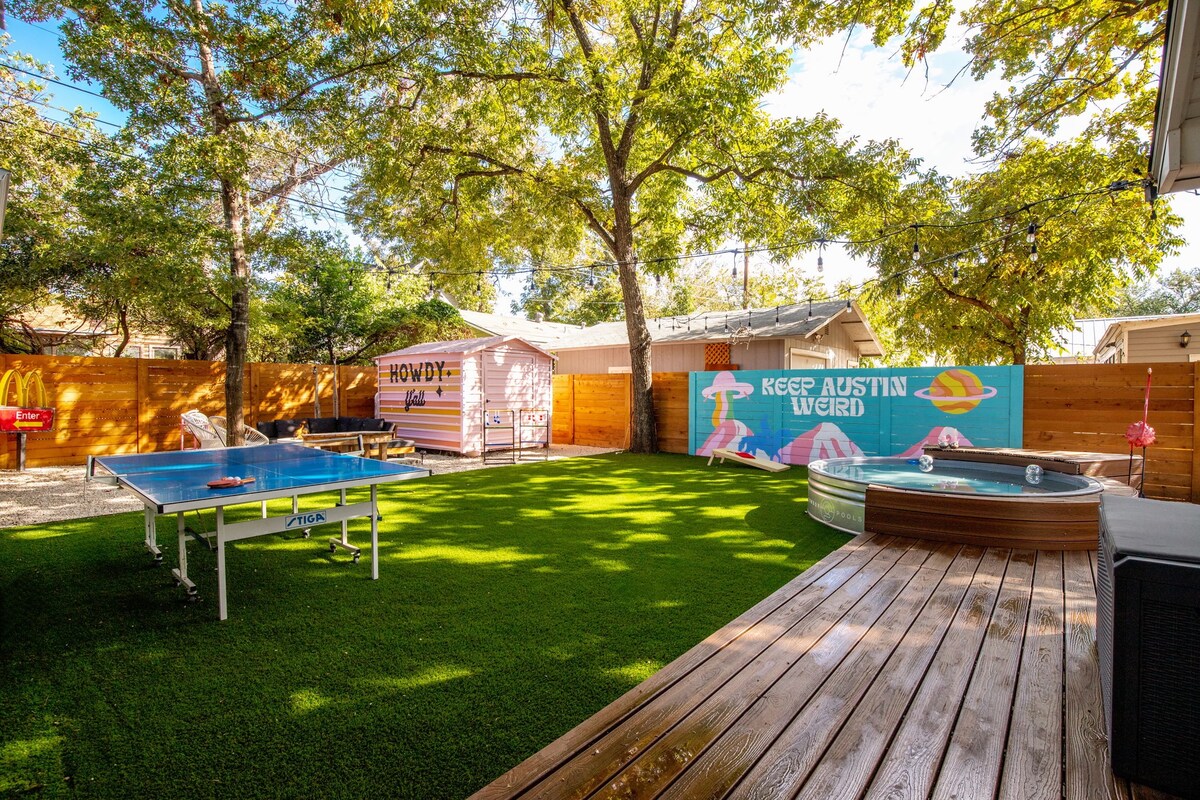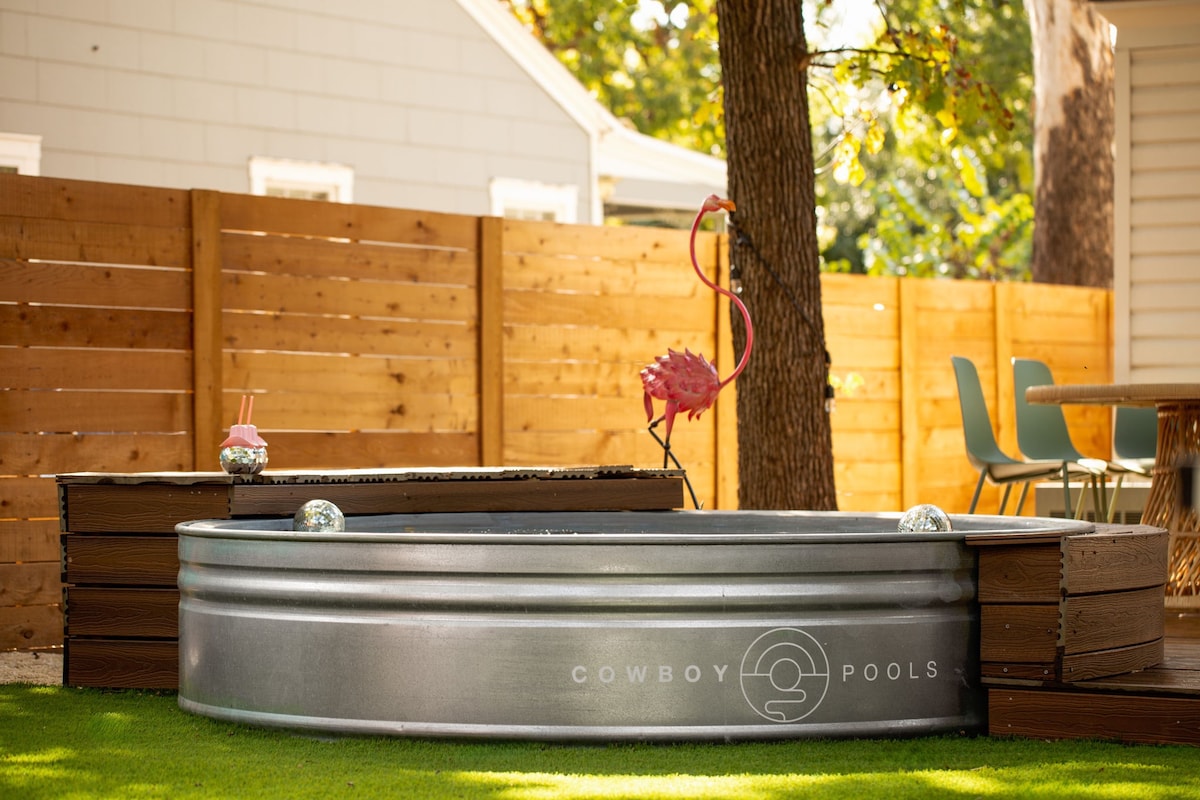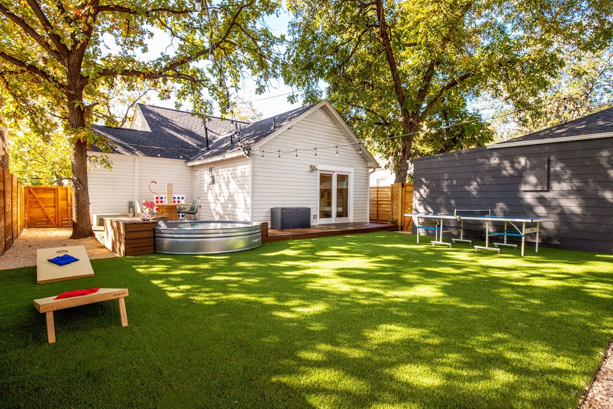 2 miles to downtown! Resort backyard with Heated 8 Ft Cowboy Pool, Ping Pong, and fire pit, 800 sqft of turf for endless fun! This listing is for the main house (3/2) and back house that has a king bed and pull out sofa +kitchen and bath on the same property!